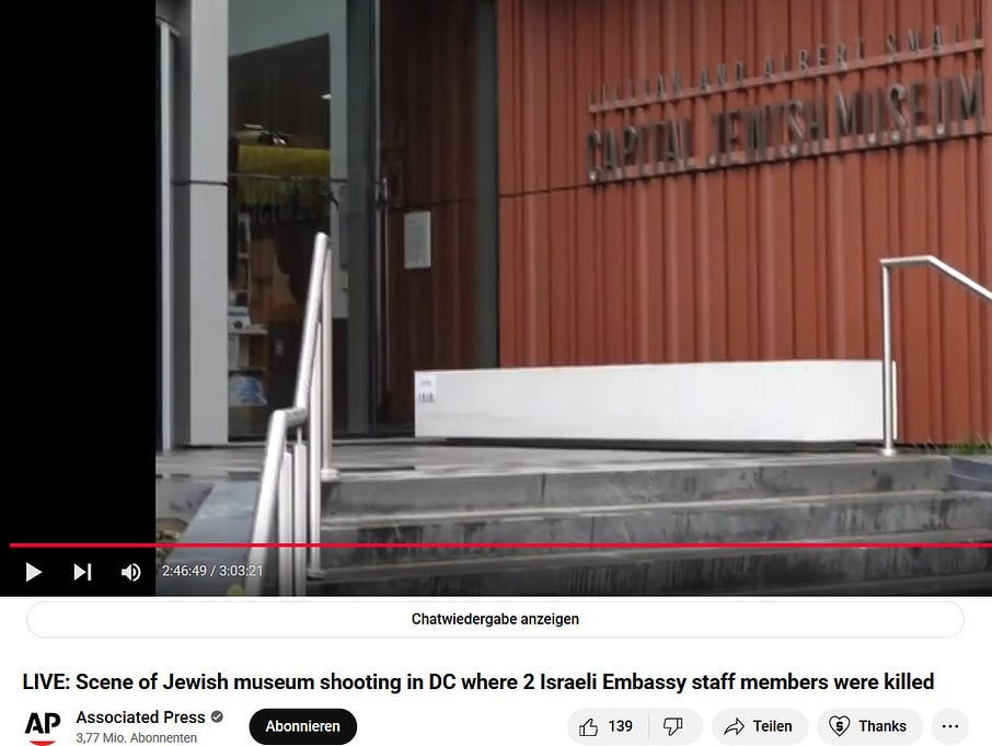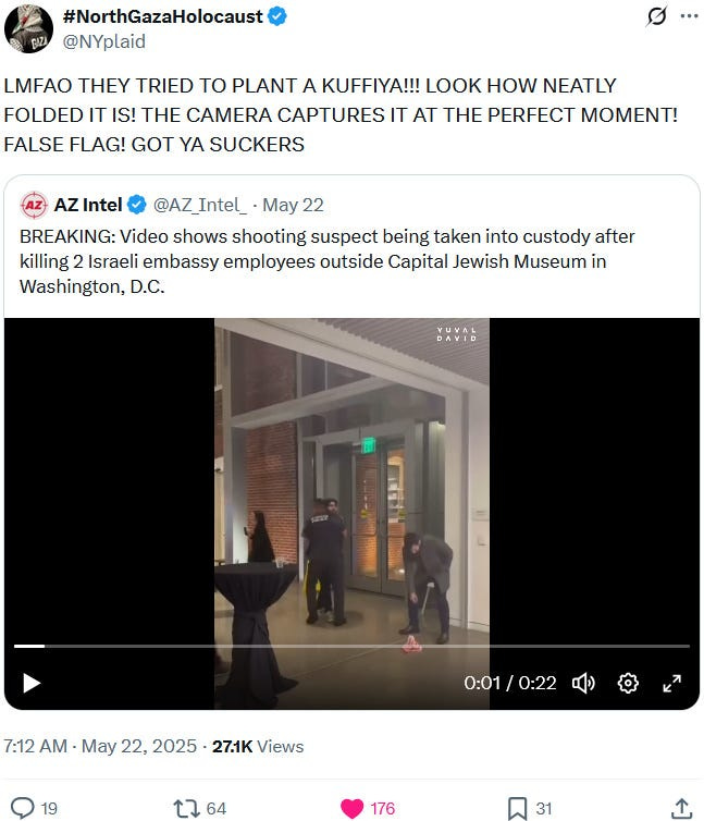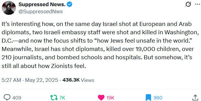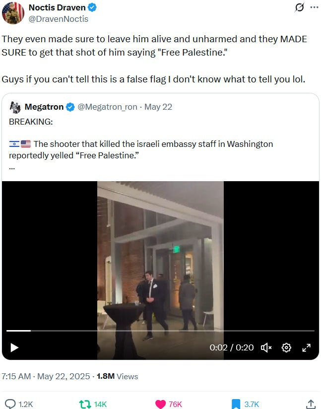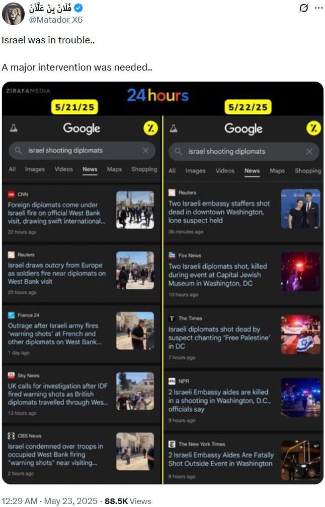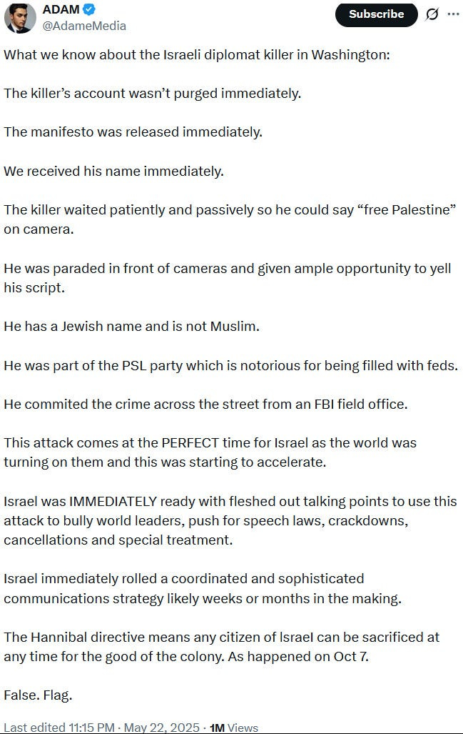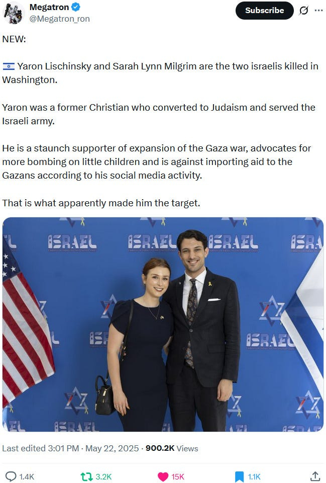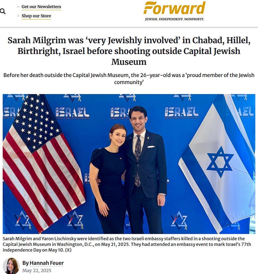 Also take note of this additional suspicious detail: Ziofascist Israel created a global diplomatic scandal due to its crazed IDF genociders May 21, 2025 shooting — and the two alleged May 22 victims just so happen to be diplomats too?! Wouldn’t that be the perfect setup to try to overwrite the memory or memory-hole the real diplomatic scandal?