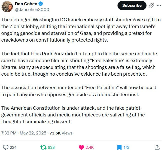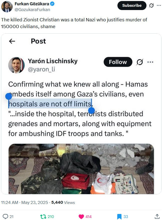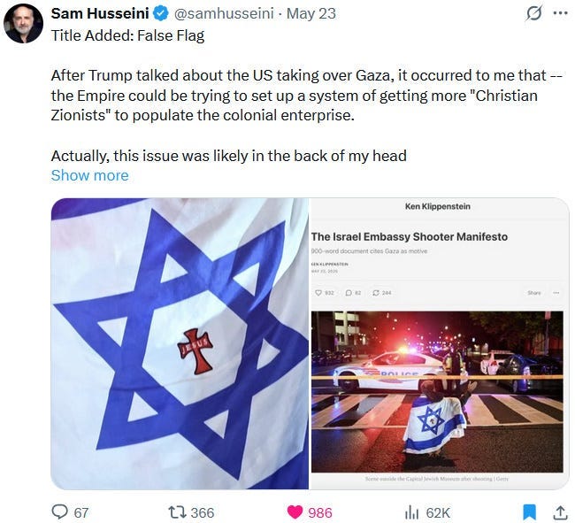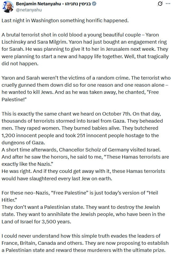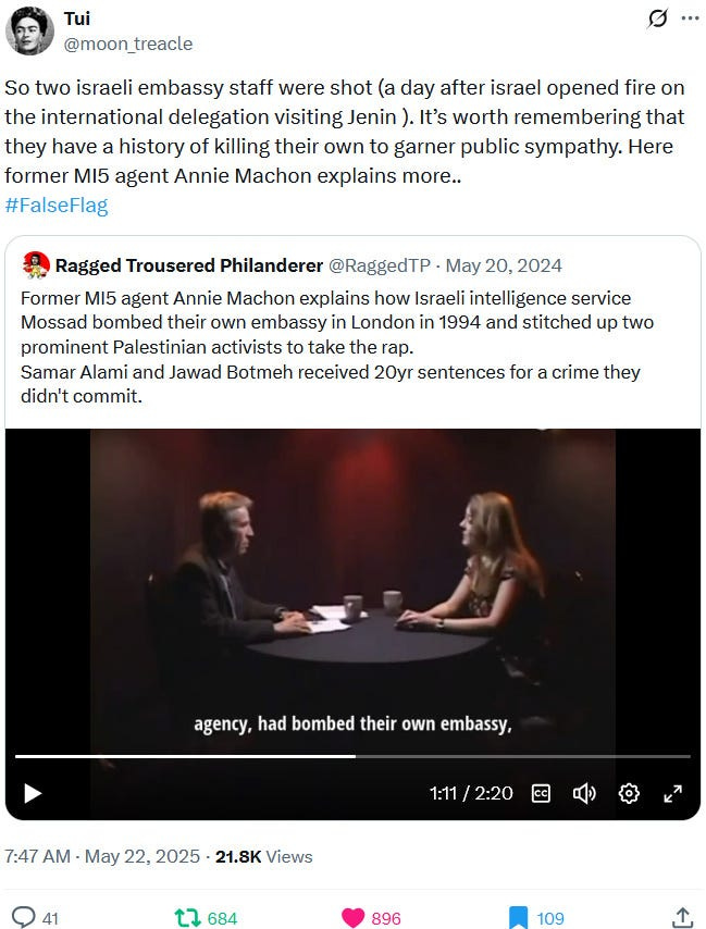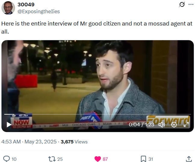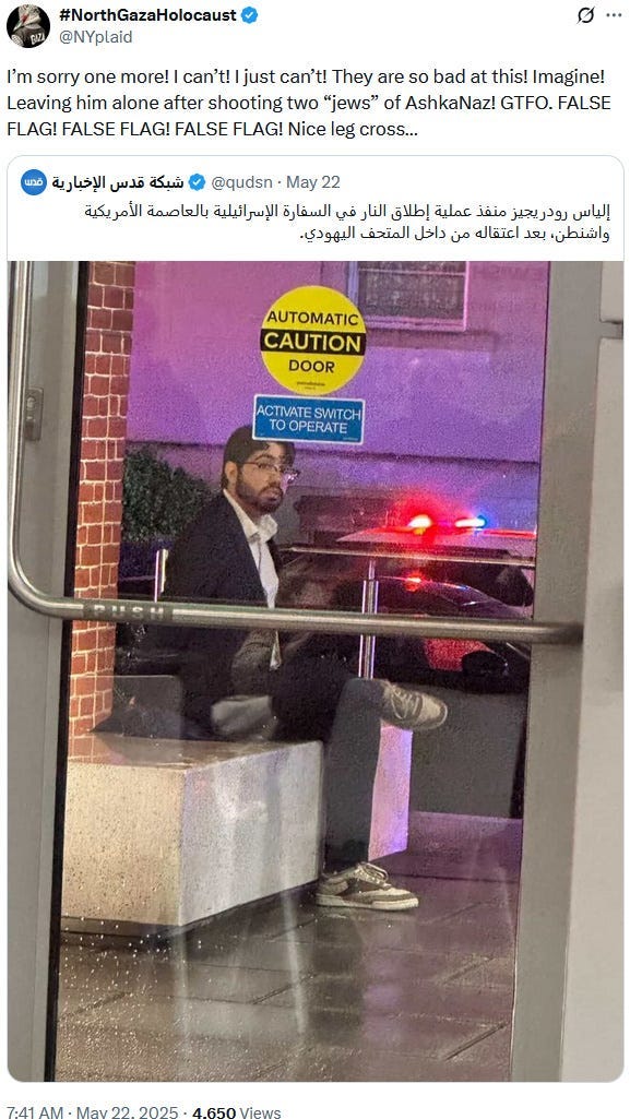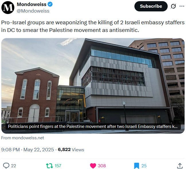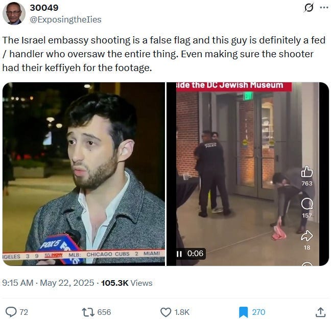 Also take note of this additional suspicious detail: Ziofascist Israel created a global diplomatic scandal due to its crazed IDF genociders May 21, 2025 shooting — and the two alleged May 22 victims just so happen to be diplomats too?! Wouldn’t that be the perfect setup to try to overwrite the memory or memory-hole the real diplomatic scandal?