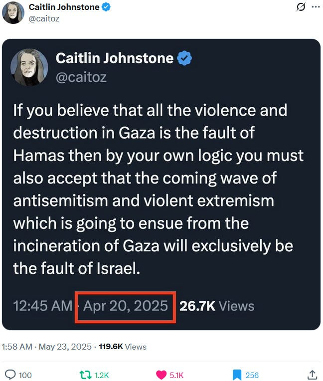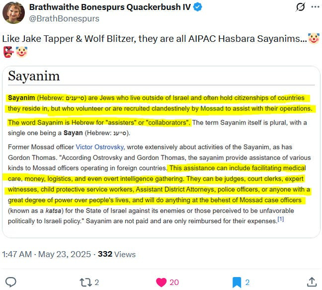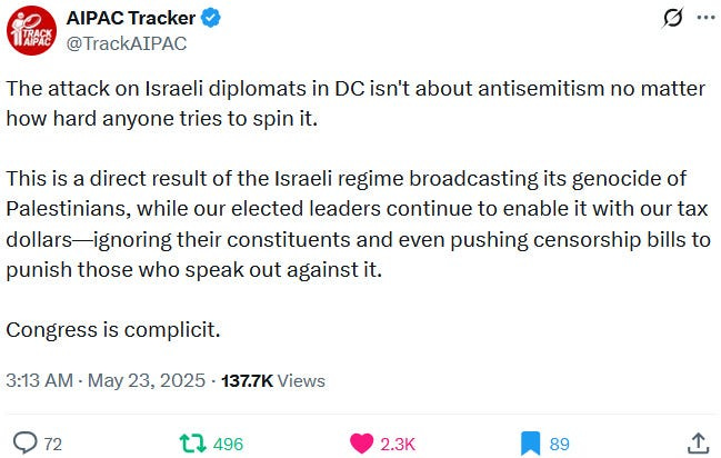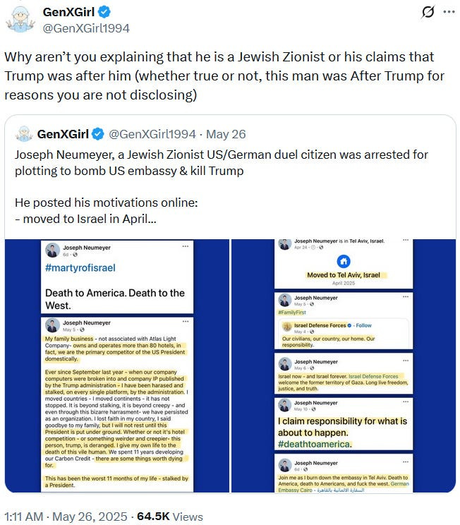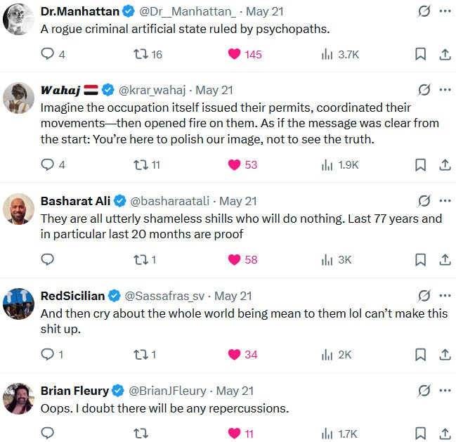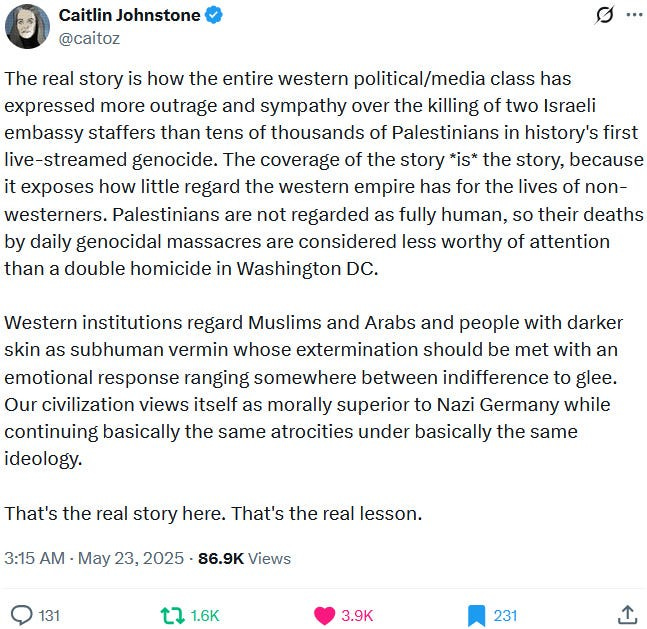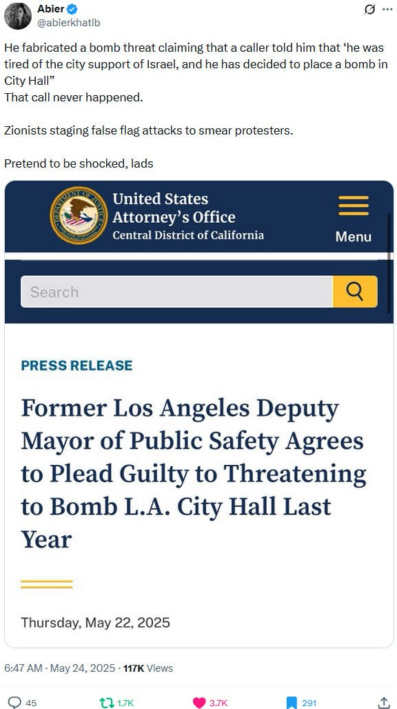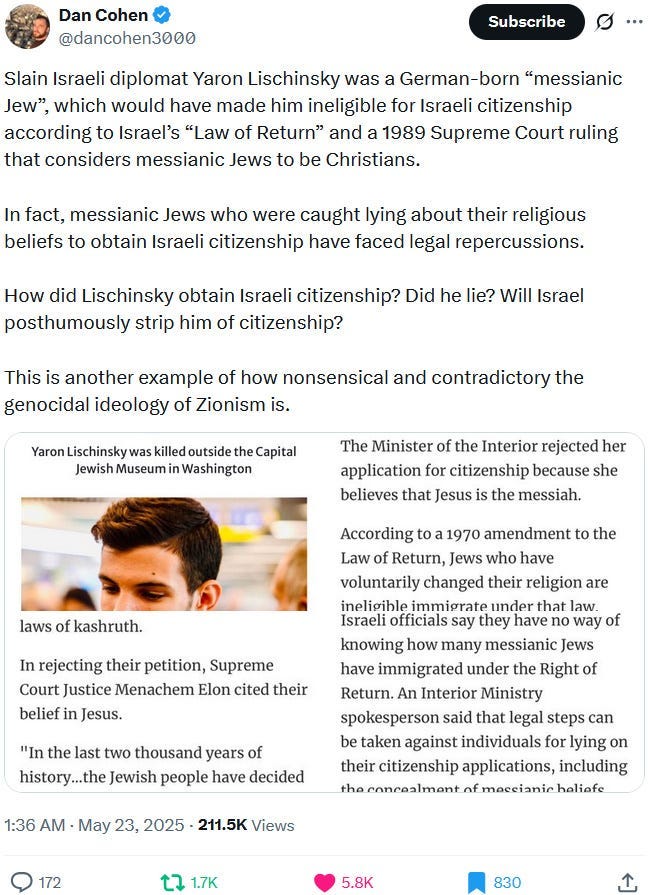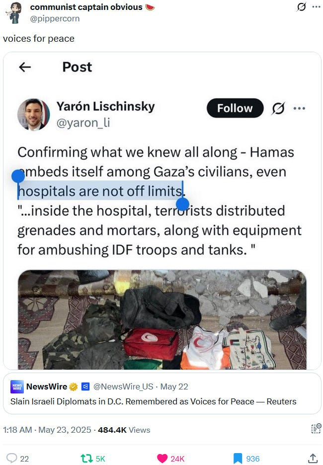 Also take note of this additional suspicious detail: Ziofascist Israel created a global diplomatic scandal due to its crazed IDF genociders May 21, 2025 shooting — and the two alleged May 22 victims just so happen to be diplomats too?! Wouldn’t that be the perfect setup to try to overwrite the memory or memory-hole the real diplomatic scandal?