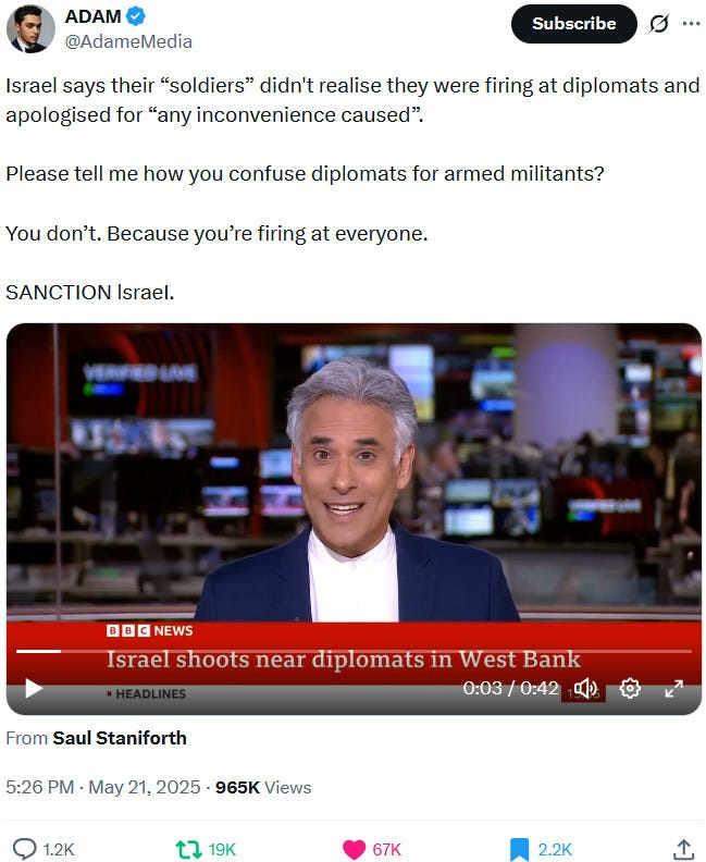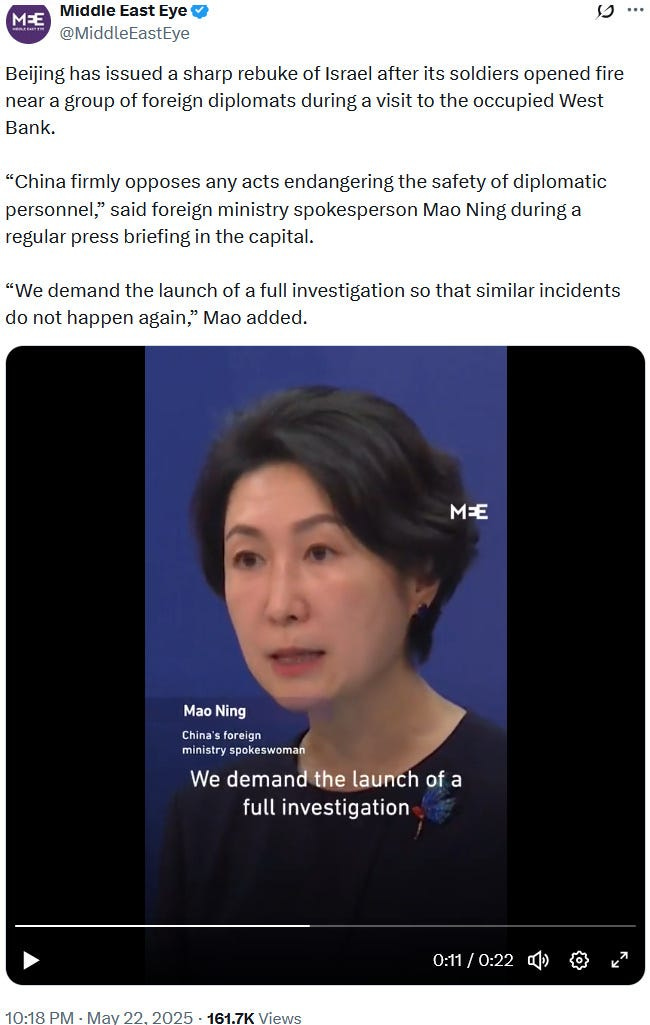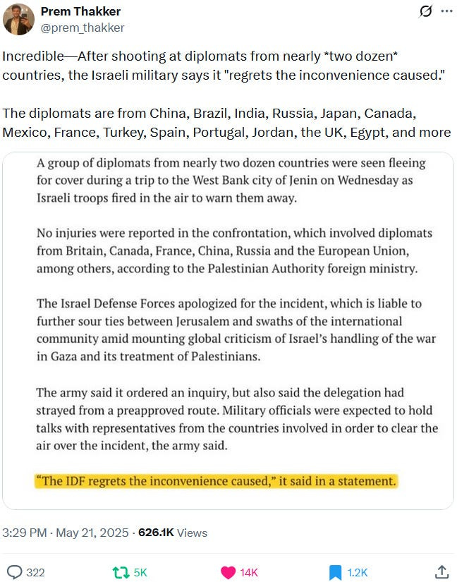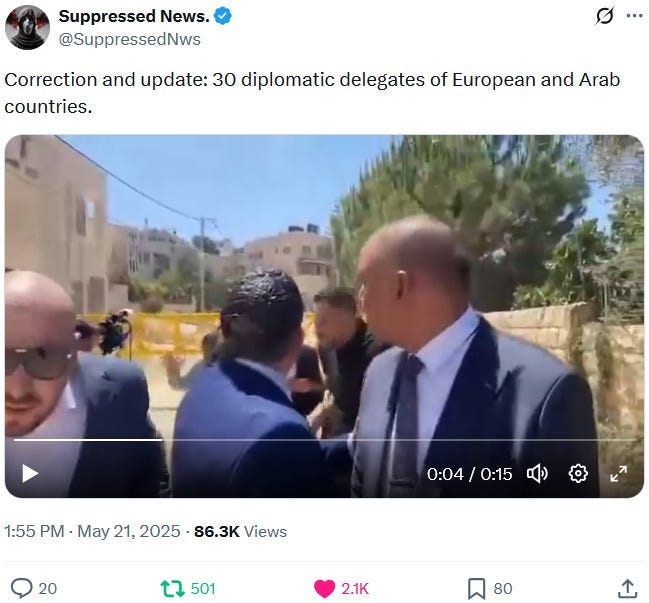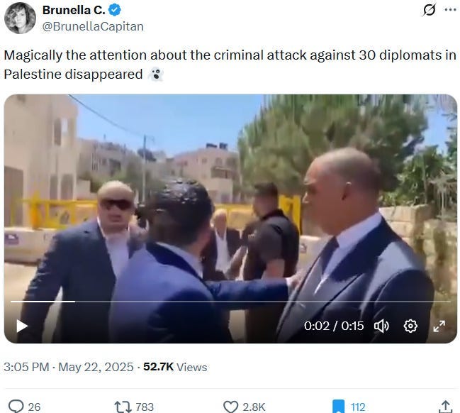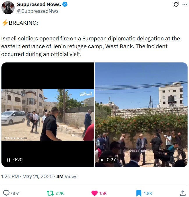To make the political and diplomatic situation even worse, insane IDF settlers masquerading as soldiers shot at a big international diplomatic delegation on May 21, 2025: