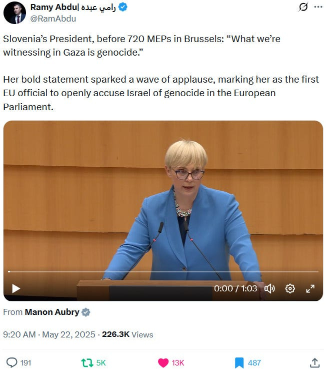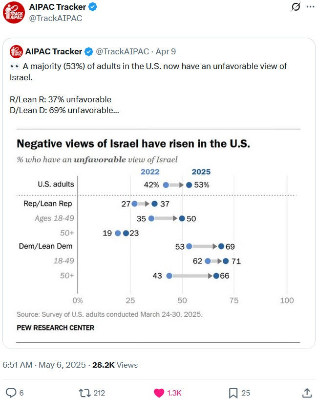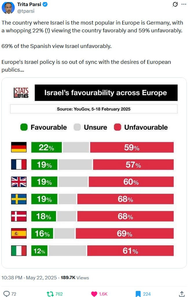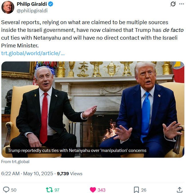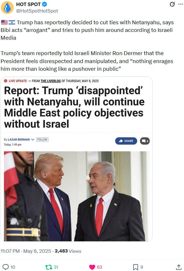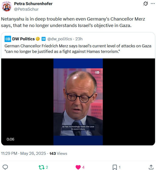 In May 2025, the Zionazi entity had to deal with a narcissistic anti-Netanyahu flare-up from Trump and mostly no more than European lip service and fig-leaf-for-genocide backlash but nevertheless backlash from Western (mis)leaders who have increasing troubles with selling the genocide and repressing anti-genocide protests and actions: