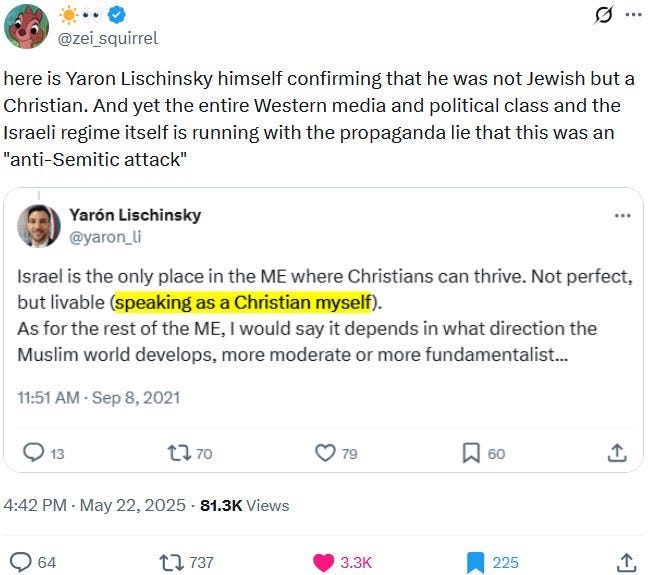 Another factor that speaks heavily in favor of the alleged shooting being a Ziofascist false flag attack relates to Yaron Lischinsky being a Christian Ziofascist: