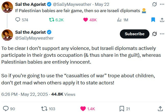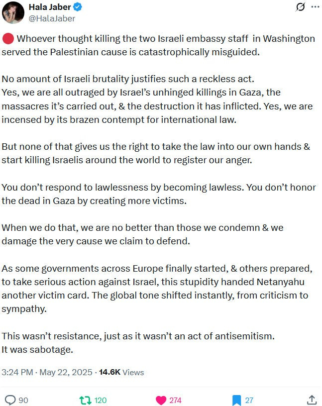 In other words: Yaron and Sarah appear to have been killed because a) they were both genocide supporters and advertisers, b) because people across the global have waited too long for justice for Palestine and Palestinians and c) because some people now appear to be taking justice into their own hands and due to more powerful parties doing little to nothing in that regard:
