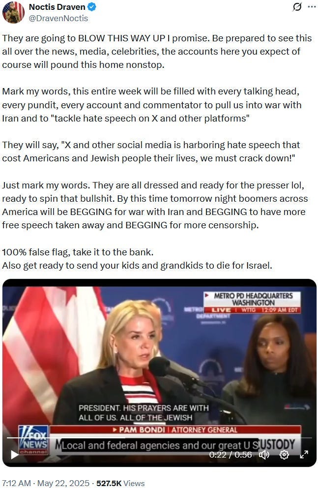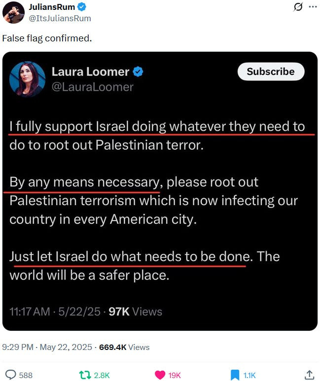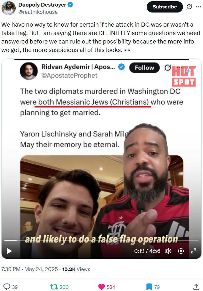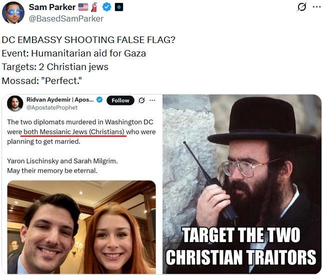 The May 21, 2025 Rodriguez-Lischinsky-Milgrim incident two days later in turn very much looks like a Ziofascist false flag attack and attempt to propagandistically patch or band-aid that increasingly gaping rift with a highly symbolic Christian-messianic and Jewish-messianic Ziofascist soppy and on-the-nose love story that was supposedly brutally torn apart by some ‘antisemitic terrorist’ who also targetted a Christian (*gasp*) who was oh so very much loved by a Jew (*awwwww*). But there are just a few too many timely ‘coincidences’ for this to not be a psyop and false flag, also due to the so far completely missing hard evidence for a shooting and two deaths — and never mind the long and still ongoing history of Ziofascist false flags.