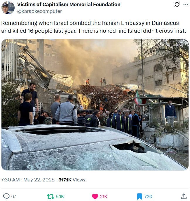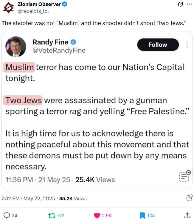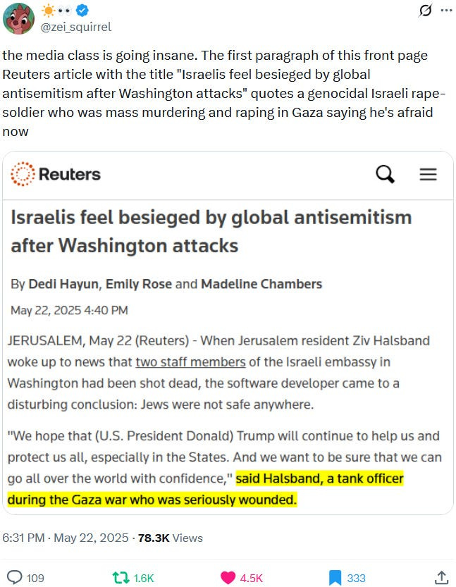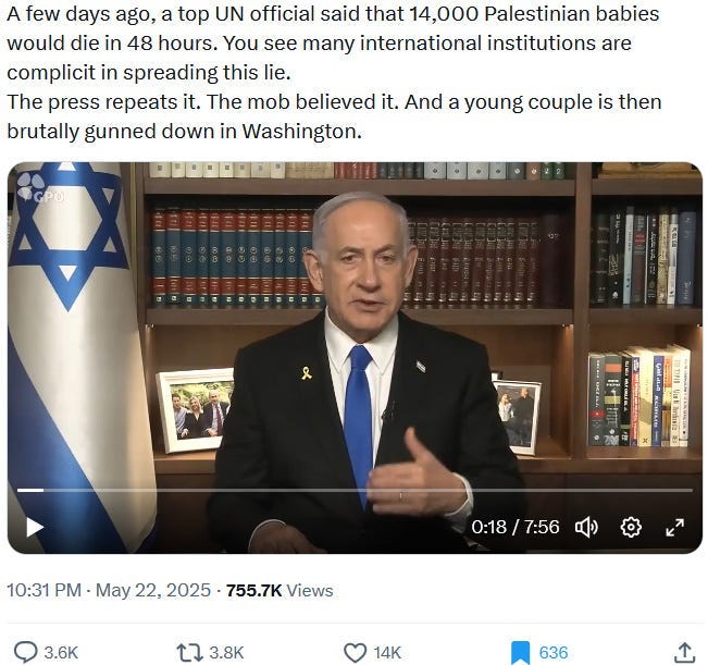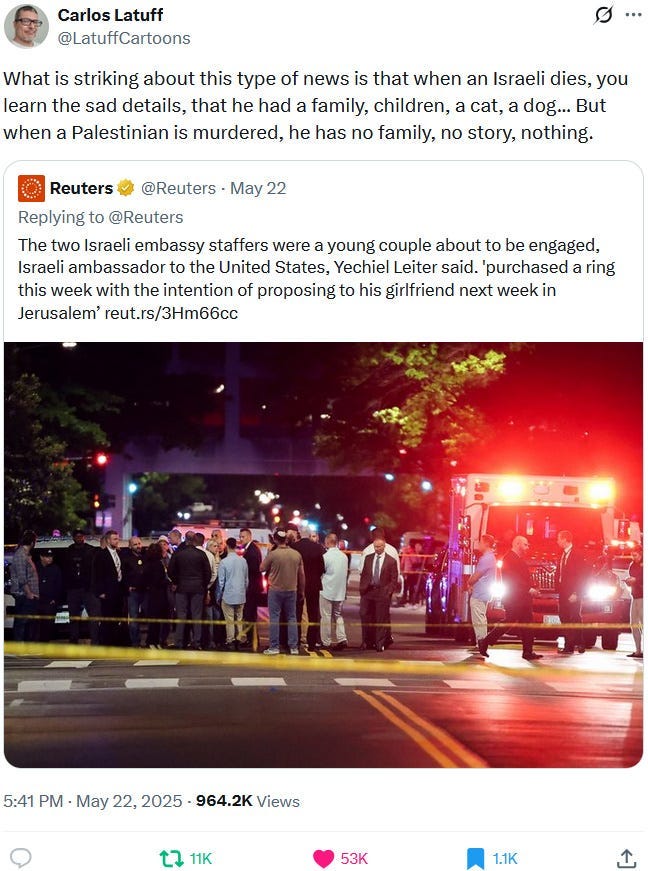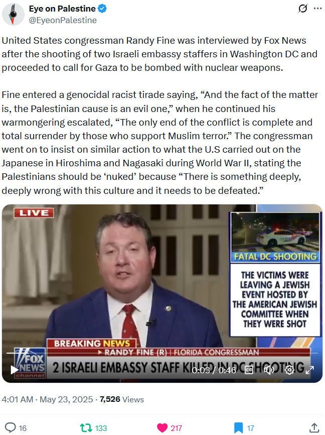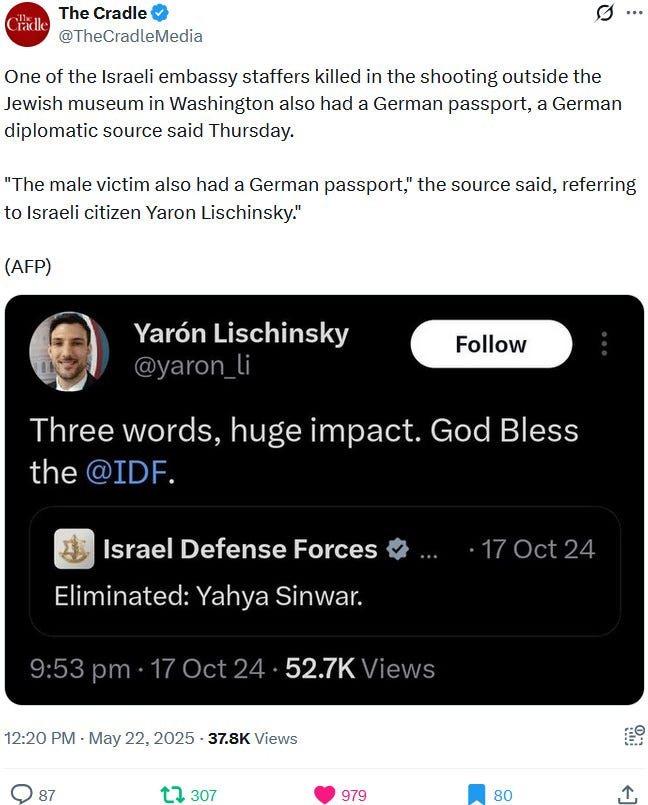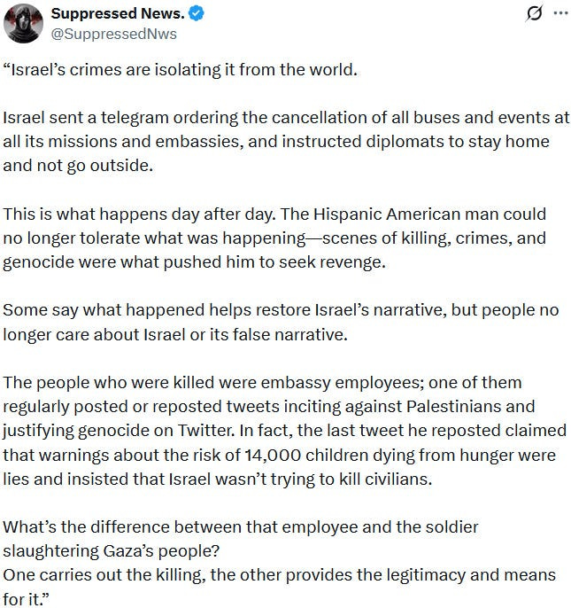 Ziofascists also exploit the alleged diplomat shooting in Washington to distract from their own diplomat shooting in Jenin on May 21, 2025 and from their genocide at large: