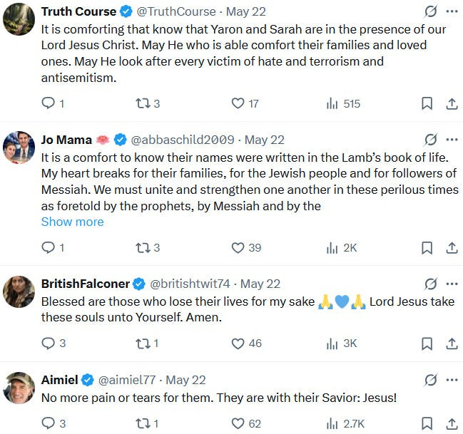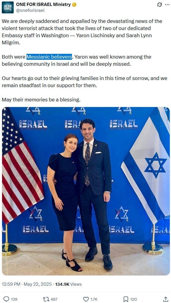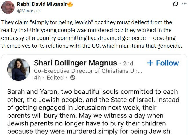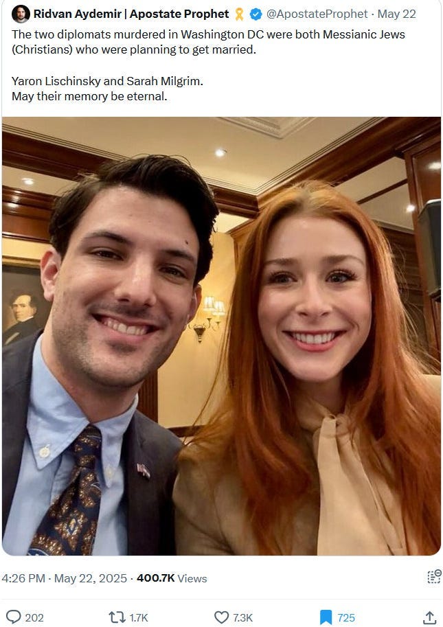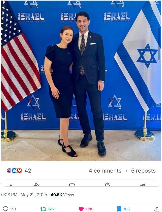 But oh noes, here comes evil ‘antisemite’ ‘pro-Hamas terrorist’ Elias Rodriguez and ruins everything for this perfect Christian-Jewish-Ziofascist-messianic couple and union. Christians, feel very threatened by pro-Hamas antisemites, for you could be next! — or so the Ziofascist Israeli propaganda wants you to believe.