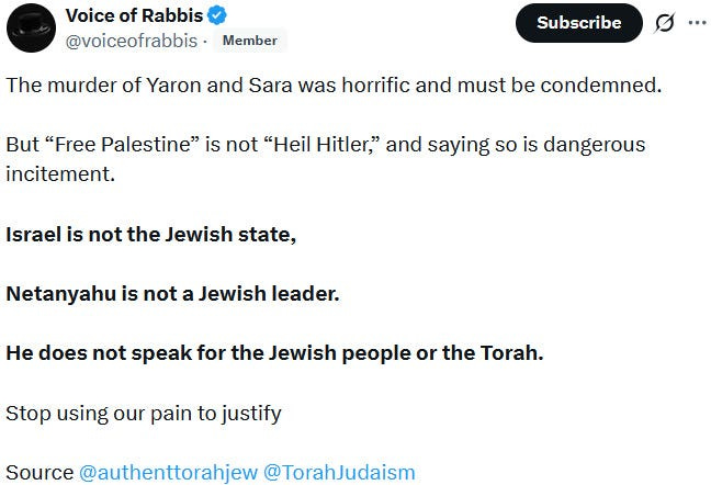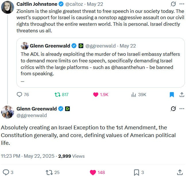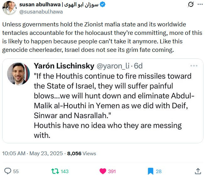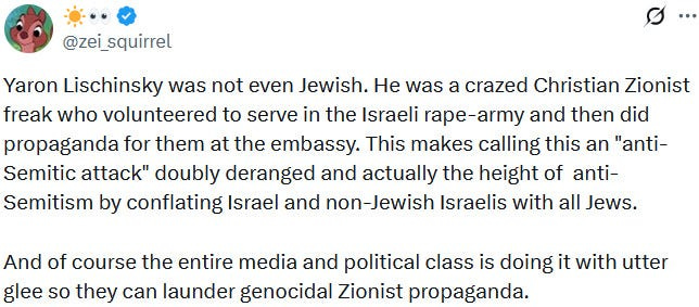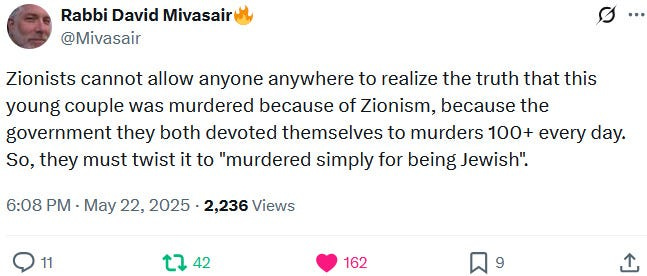What is being omitted by mainstream sources though is that both of the alleged victims were hardcore Zionists who were fully onboard with Ziofascist Israel’s genocide and genocide propaganda. This is why they were targetted, thus once again confirming that Zionism is antisemitic: