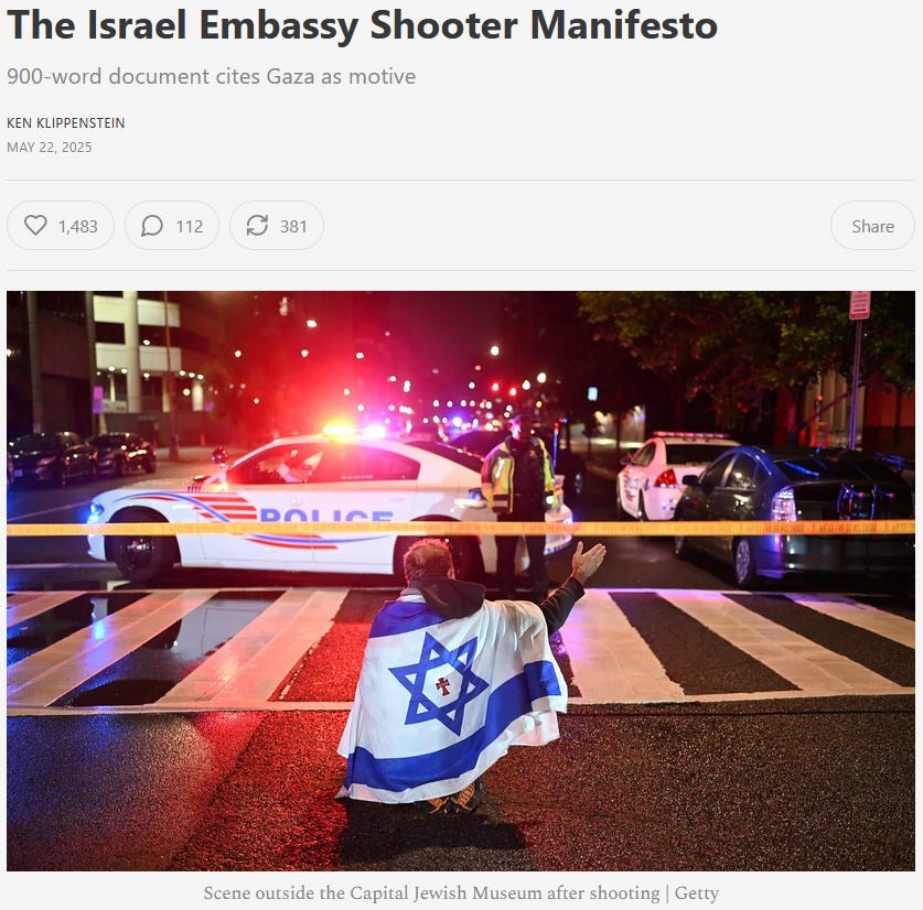 Note how the title of the following article by Ken Klippenstein misleadingly suggests that the shooting happened at the Israeli embassy: