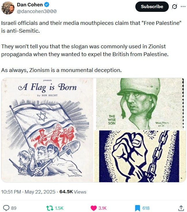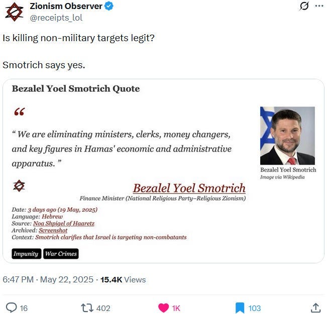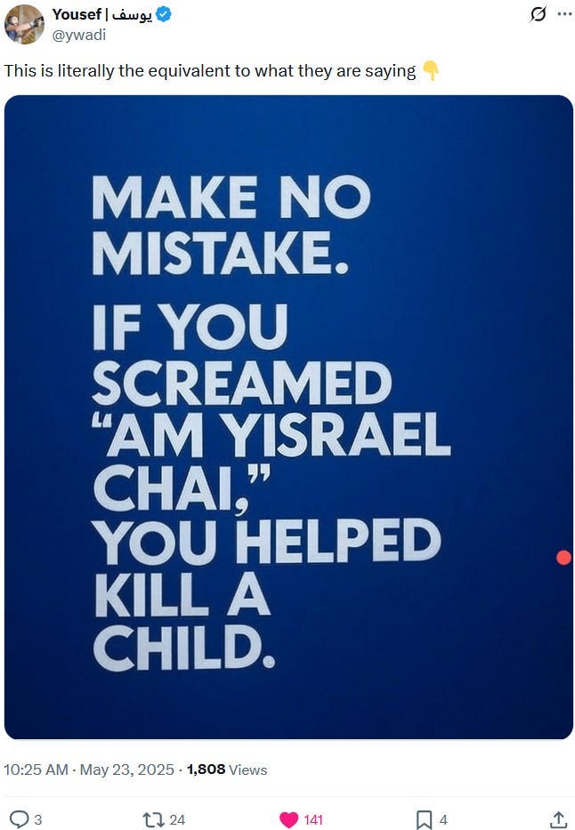 Yet if one were to adhere to that (and in terms of a refutation via reductio ad absurdum), then it would also follow that every Ziofascist who ever screamed “Am Yisrael Chai” — i.e. their dogwhistle version of “Heil Hitler” — would also need to be held accountable for Ziofascist Israel’s genocide, war crimes and crimes against humanity against Palestinians: