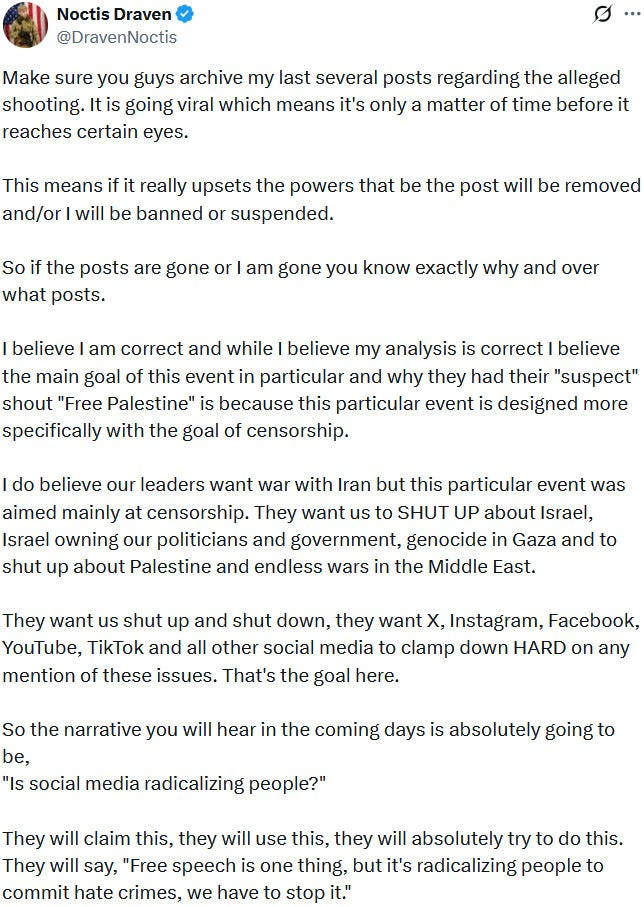 On the other hand and at the other end of the spectrum and conceivable scenarios, it is also possible that everything about Elias Rodriguez and his alleged manifesto is fake: Intelligence agencies are also known to create fake identities and persons to infiltrate movements (e.g. the UK spycops scandal), and maybe that is also the case for the alleged shooter and his alleged manifesto.