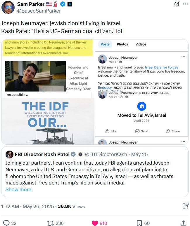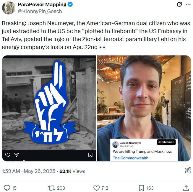 Perhaps more importantly, Neumeyer appears to be a Jewish Ziofascist who posted favorably about the genocide-committing Netanyahu, IDF and even the Ziofascist terrorist organisation Lehi — relevant information which both the BBC propaganda article and the FBI director Kash Patel omitted in his post on X: