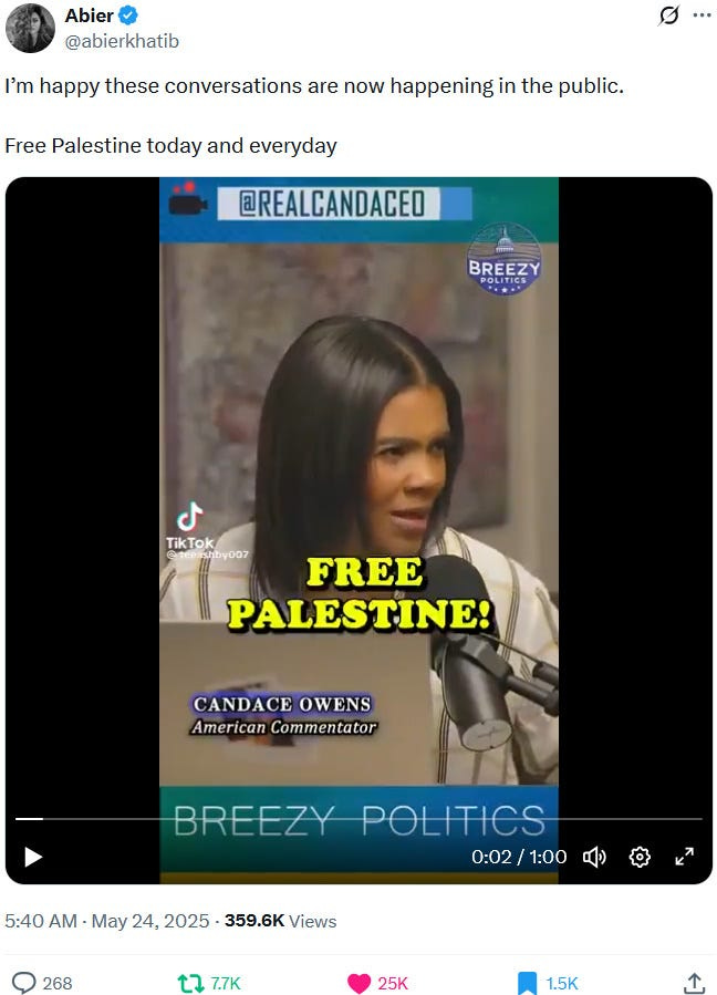 Candace Owens: “They’re trying to criminalize people that are saying ‘Free Palestine’ or speaking about Gaza. […] basically punishing us and calling for us to be cancelled and banned […].”