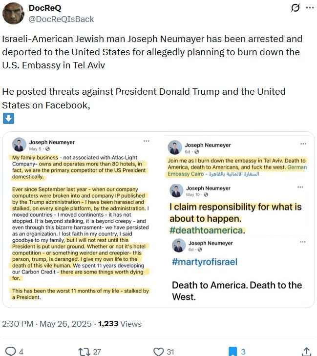 The May 19, 2025 Neumeyer incident brings us full circle and represents the other side of the coin of the same case of falling out: Section 1 highlighted how the USA and the West in general are increasingly falling away from Ziofascist Israel and its genocide, war crimes, crimes against humanity and its overall insanity. The Neumeyer case in turn represents a case of a Ziofascist in Israel falling away from the USA and the West due to the West’s perceived or real lack of support for the one and only genocidal terrorist demonocracy in the Middle East. Both aspects together represent an increasing rift between the Ziofascist USA and the West on the on hand and Ziofascist Israel on the other hand.