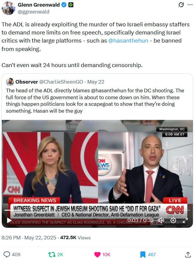 From the Ziofascist ‘Apartheid Distraction League’ which exploits the alleged shooting to demand more censorship and political persecution of those who call out the crimes of Ziofascist Israel. Note that the Ziofascist Israel lobby thus indeed amounts to the biggest free speech threat in the USA: