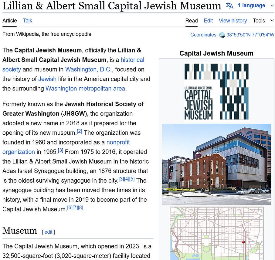 And coincidence of coincidences, there happens to be a supposedly ‘antisemitic’ incident in the Lillian and Albert Small Capital Jewish Museum on May 21, 2025, described on the Wikipedia page of that museum as supposedly having occurred as follows: