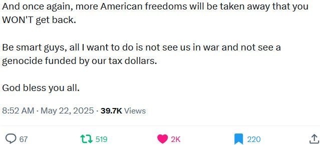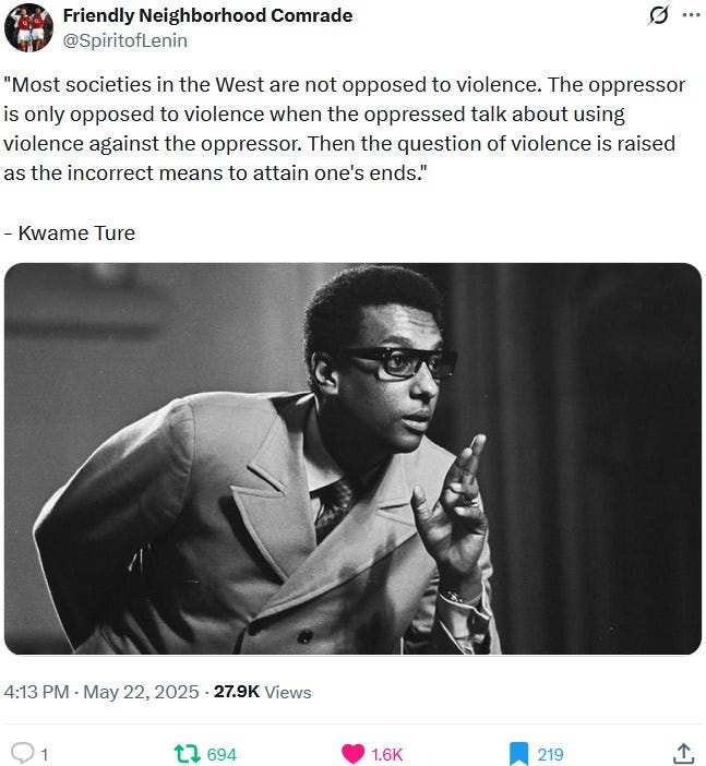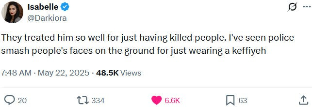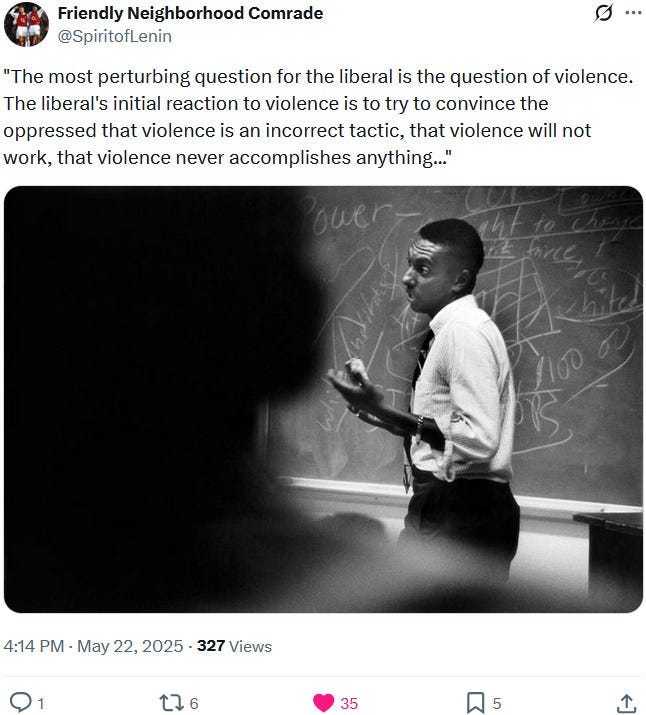 A word about the morality of armed demonstration. Those of us against the genocide take satisfaction in arguing that the perpetrators and abettors have forfeited their humanity. I sympathize with this viewpoint and understand its value in soothing the psyche which cannot bear to accept the atrocities it witnesses, even mediated through the screen. But inhumanity has long since shown itself to be shockingly common, mundane, prosaically human. A perpetrator may then be a loving parent, a filial child, a generous and charitable friend, an amiable stranger, capable of moral strength at times when it suits him and sometimes even when it does not, and yet be a monster all the same. Humanity doesn’t exempt one from accountability. The action would have been morally justified taken 11 years ago during Protective Edge, around the time I personally became acutely aware of our brutal conduct in Palestine. But I think to most Americans such an action would have been illegible, would seem insane. I am glad that today at least there are many Americans for which the action will be highly legible and, in some funny way, the only sane thing to do.