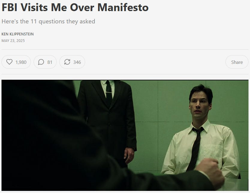 For the second time in a year, the FBI came to my home yesterday after I published the so-called manifesto of the man charged with killing two Israeli Embassy staffers in Washington.